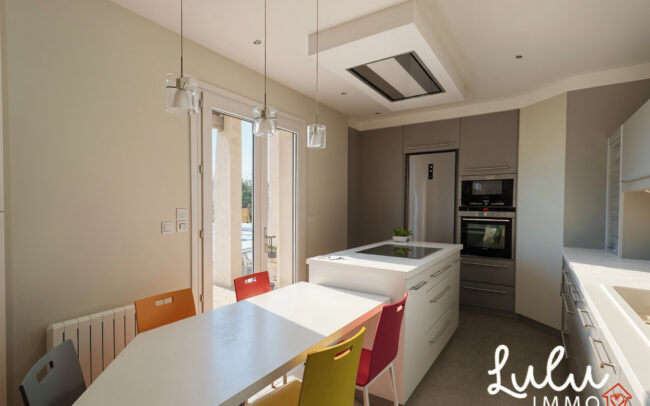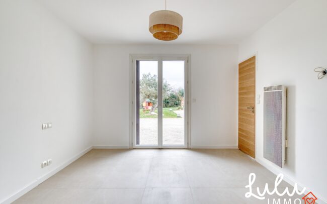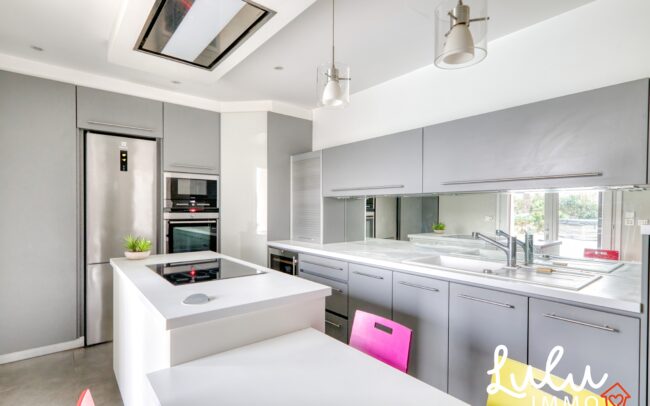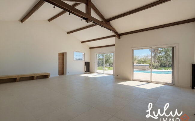 Construite en 1991 et agrandie en 2012 par une extension d’environ 60 m², cette propriété offre un véritable confort de vie de plain-pied. À l’intérieur, la maison séduit immédiatement par sa vaste pièce de vie de 62,44 m², baignée de lumière naturelle grâce à son exposition plein sud, offrant un espace à la fois convivial et chaleureux, propice à la vie de famille comme aux réceptions. La cuisine, équipée et fermée, permet un usage fonctionnel et structuré au quotidien.