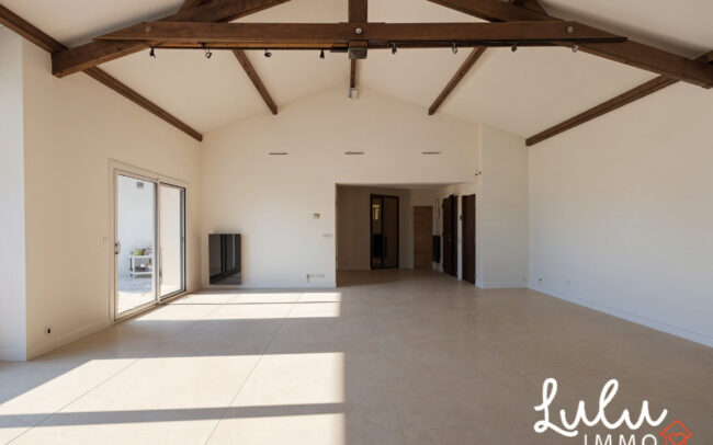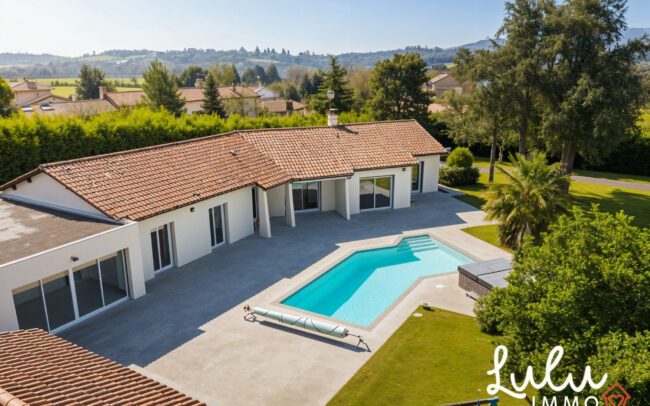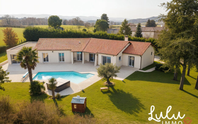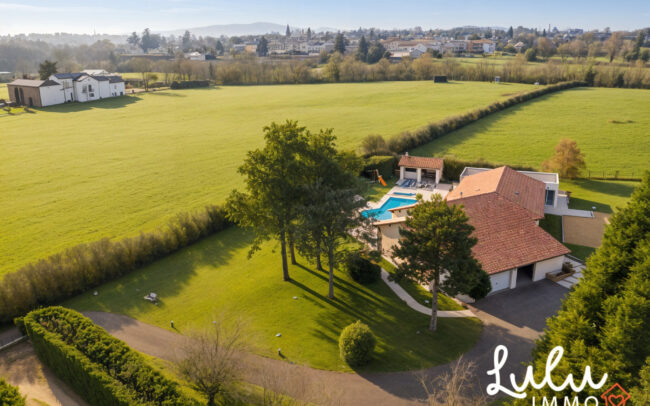 Située sur la commune très recherchée de Dommartin, à seulement 4 minutes du centre-village, cette maison individuelle de plain-pied développe environ 245 m² habitables et s’inscrit dans un environnement naturel préservé, particulièrement rare sur le secteur. Implantée sur une parcelle de 2 990 m² exposée plein sud, elle offre un cadre de vie confidentiel alliant calme absolu, vue dégagée et pérennité du paysage, rendue possible par son classement en zone naturelle garantissant l’absence de toute nuisance future.