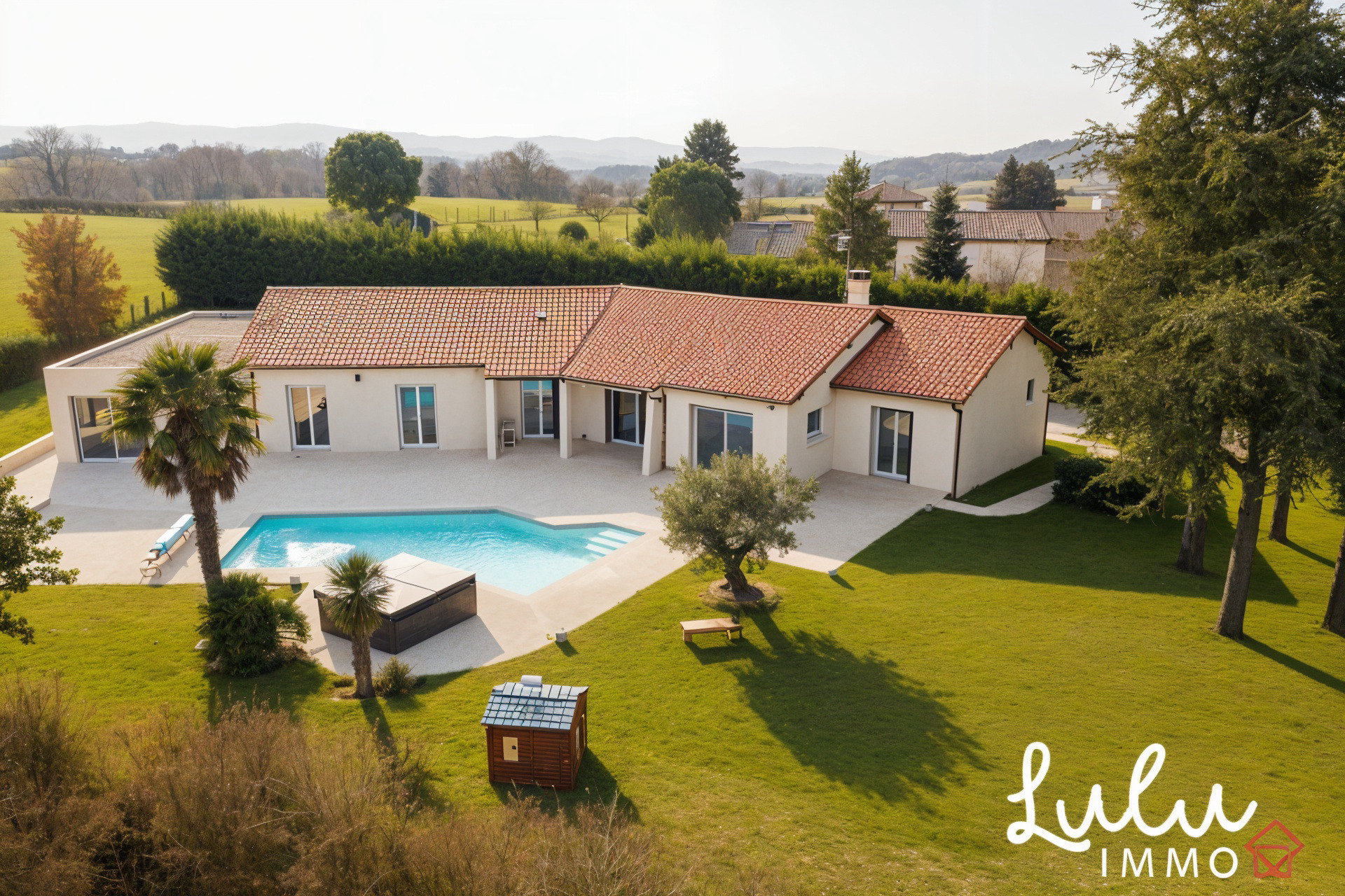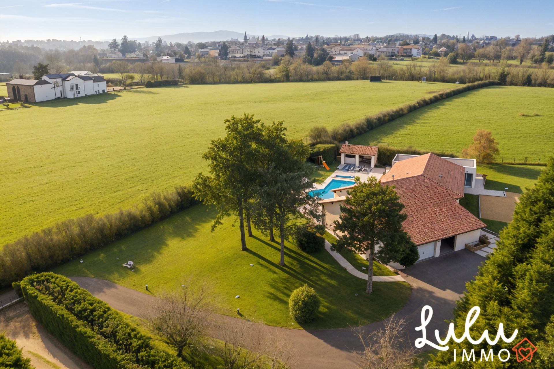 Située sur la commune très recherchée de Dommartin, à seulement 4 minutes du centre-village, cette maison individuelle de plain-pied développe environ 245 m² habitables et s’inscrit dans un environnement naturel préservé, particulièrement rare sur le secteur. Implantée sur une parcelle de 2 990 m² exposée plein sud, elle offre un cadre de vie confidentiel alliant calme absolu, vue dégagée et pérennité du paysage, rendue possible par son classement en zone naturelle garantissant l’absence de toute nuisance future.